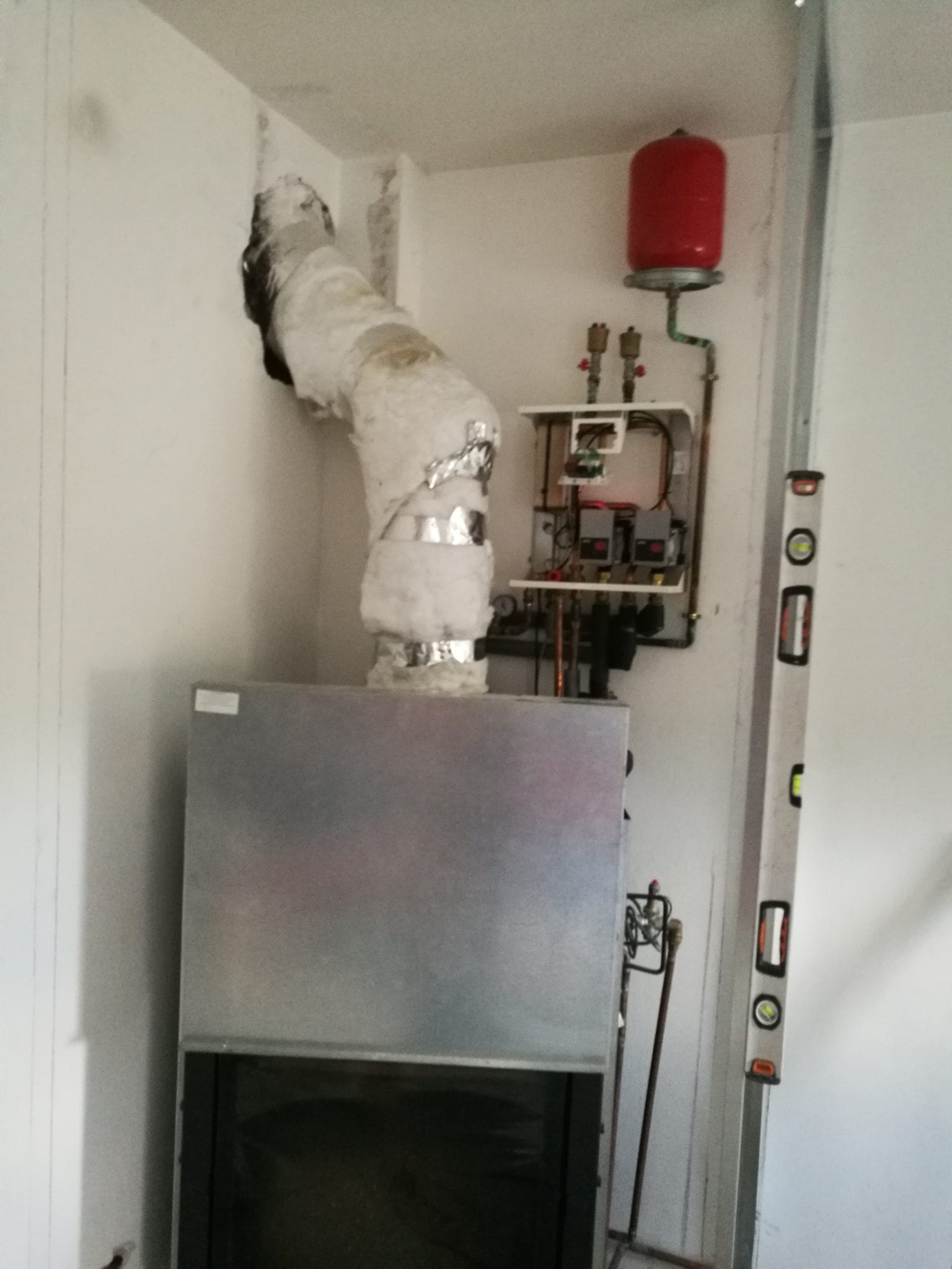 Instalación de un casoneto en esta instalación de chimenea calefactora  , con tubería de salida de humos doble envolvente de acero inoxidable de 200mm. Para la extracción ;