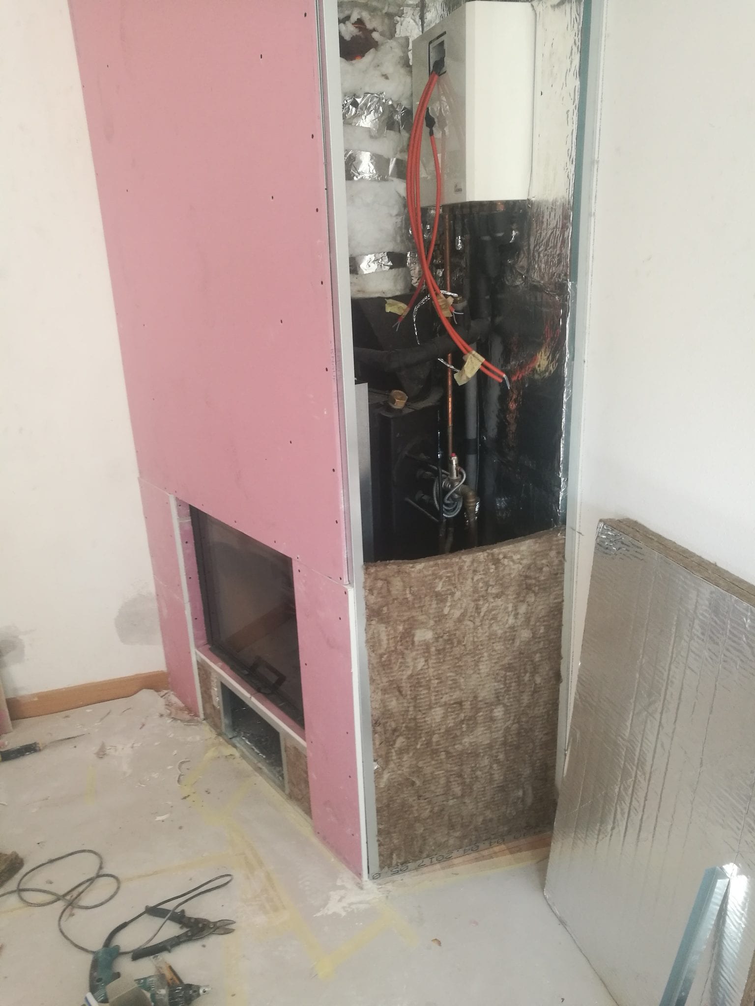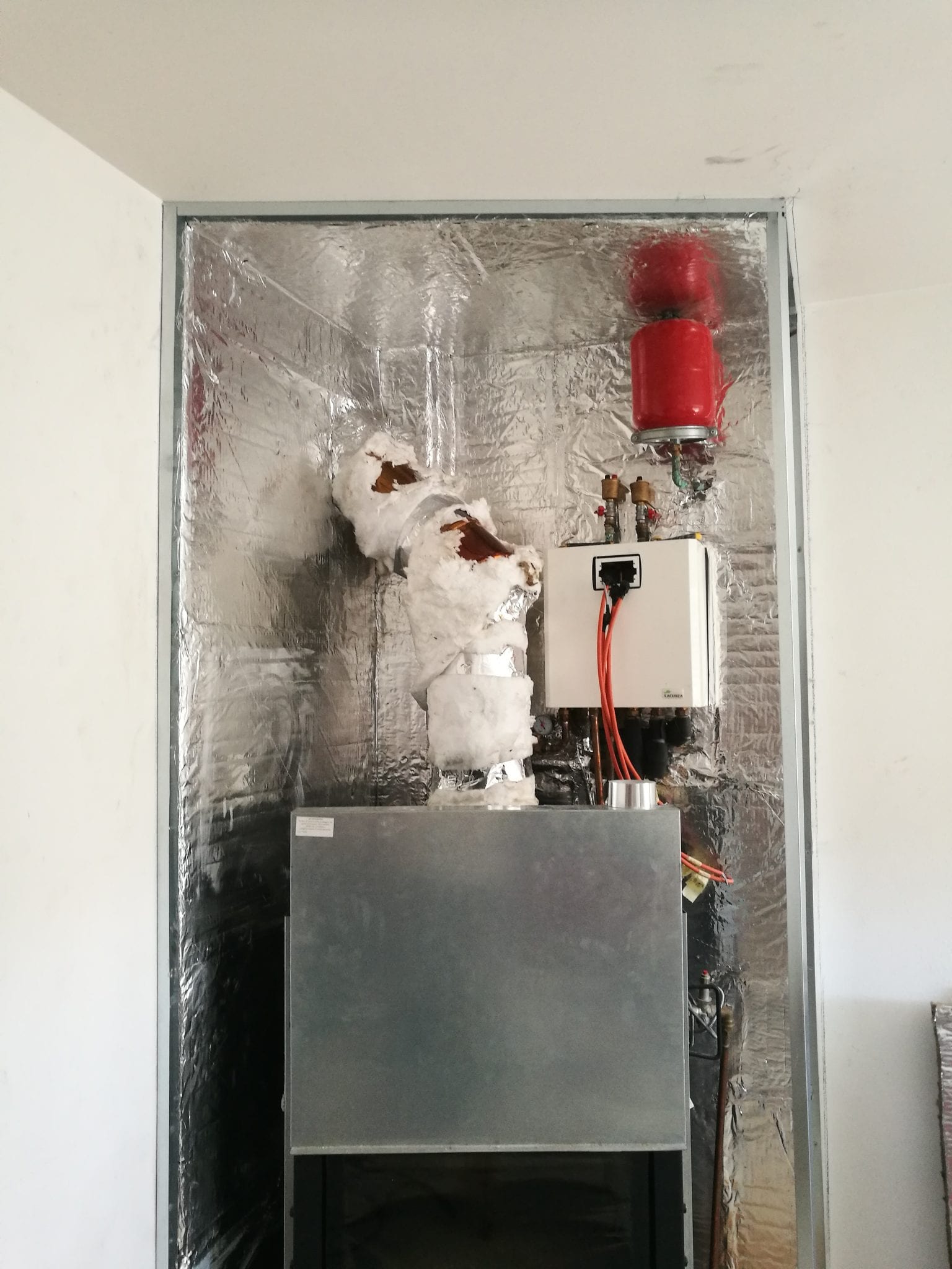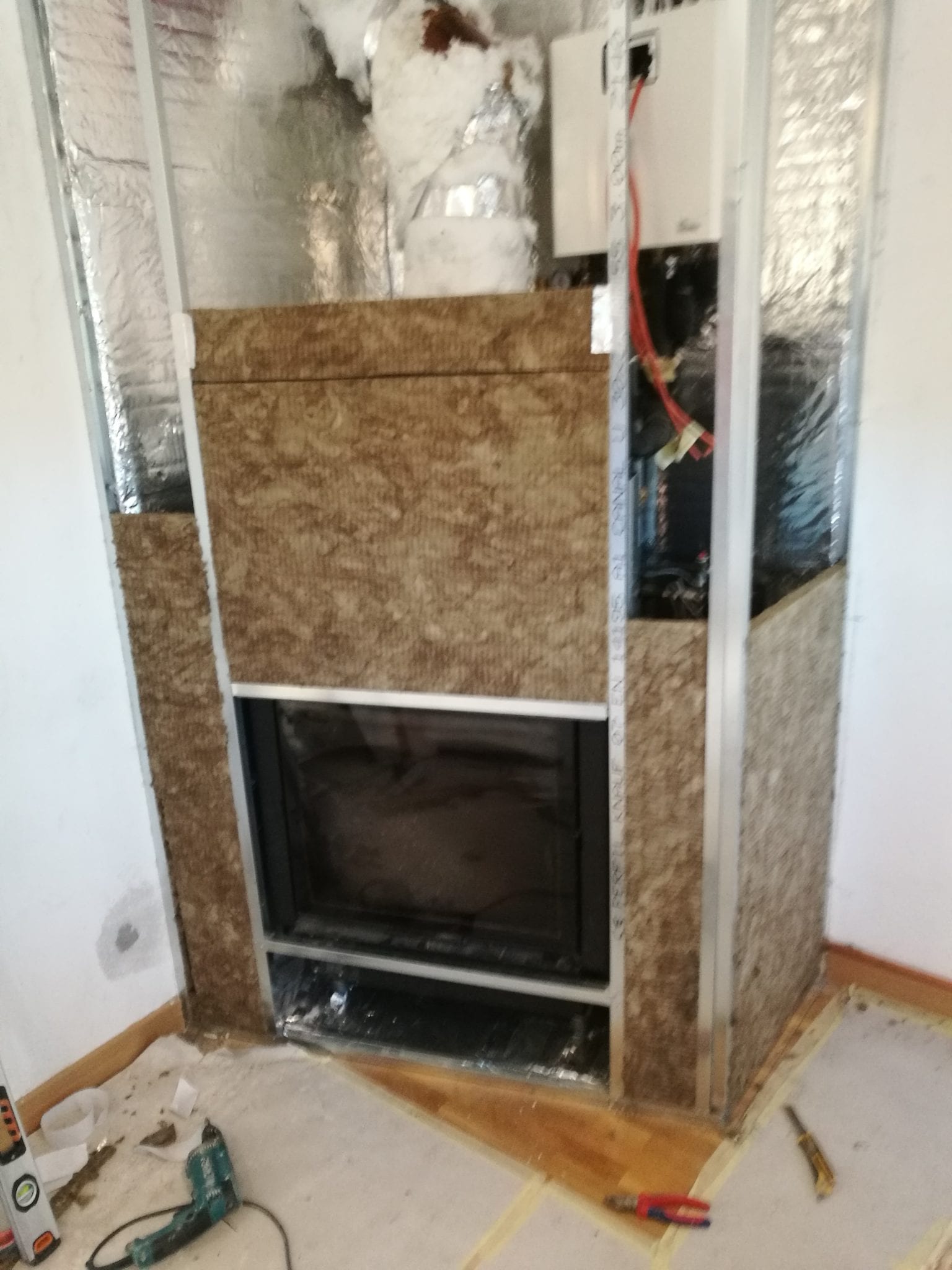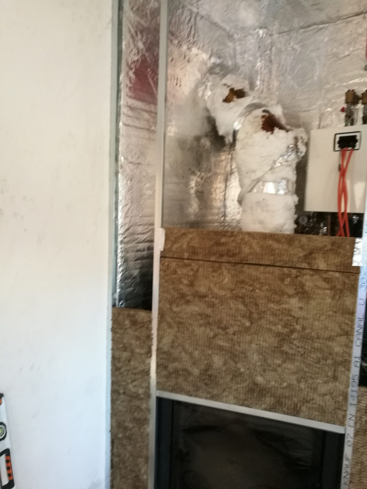 El recubrimiento  de la chimenea de leña calefactora,  se ha realizado con perfilería de acero galvanizado de 40mm y aislamiento térmico en todo el perímetro comprendido de la chimenea.