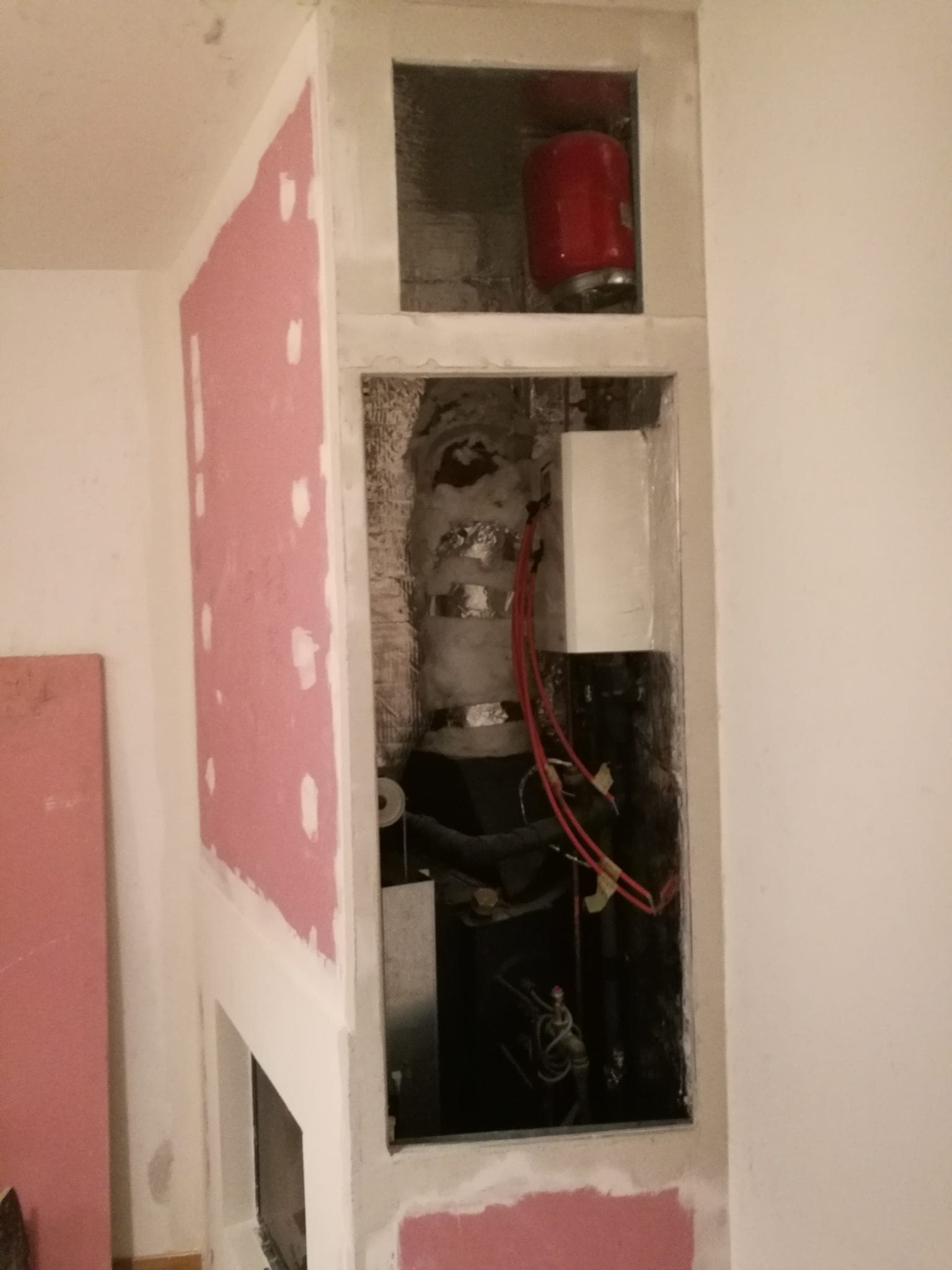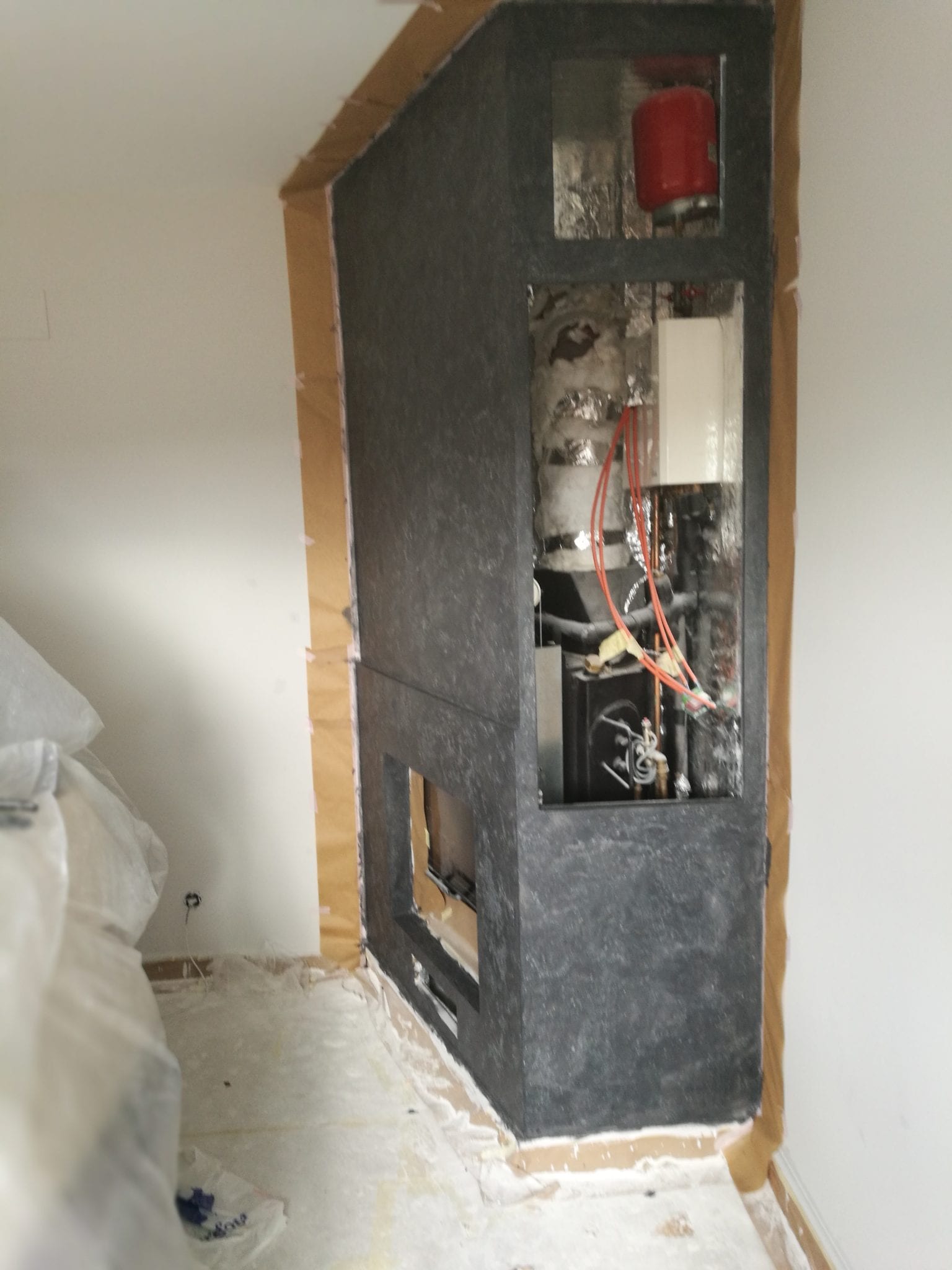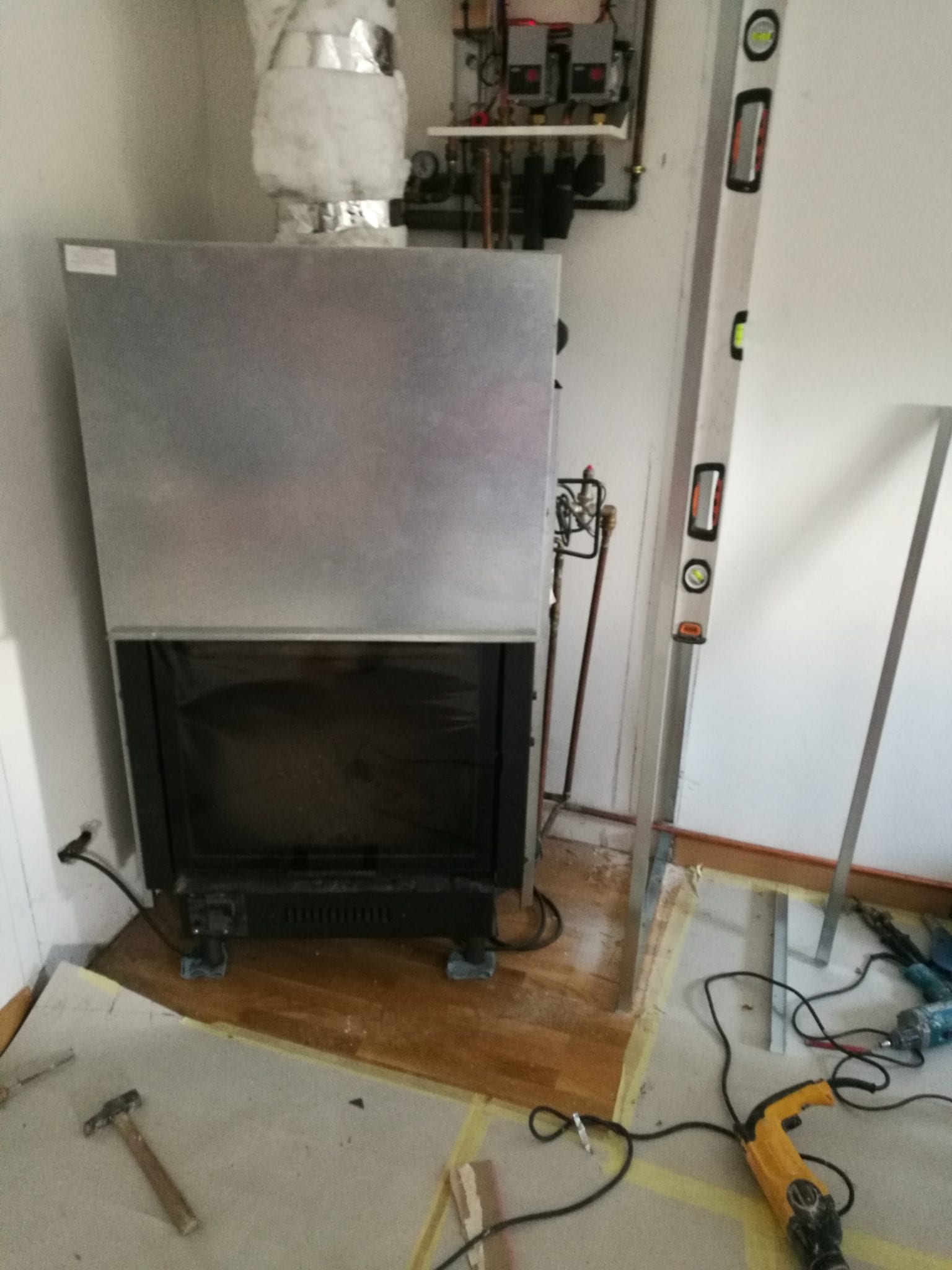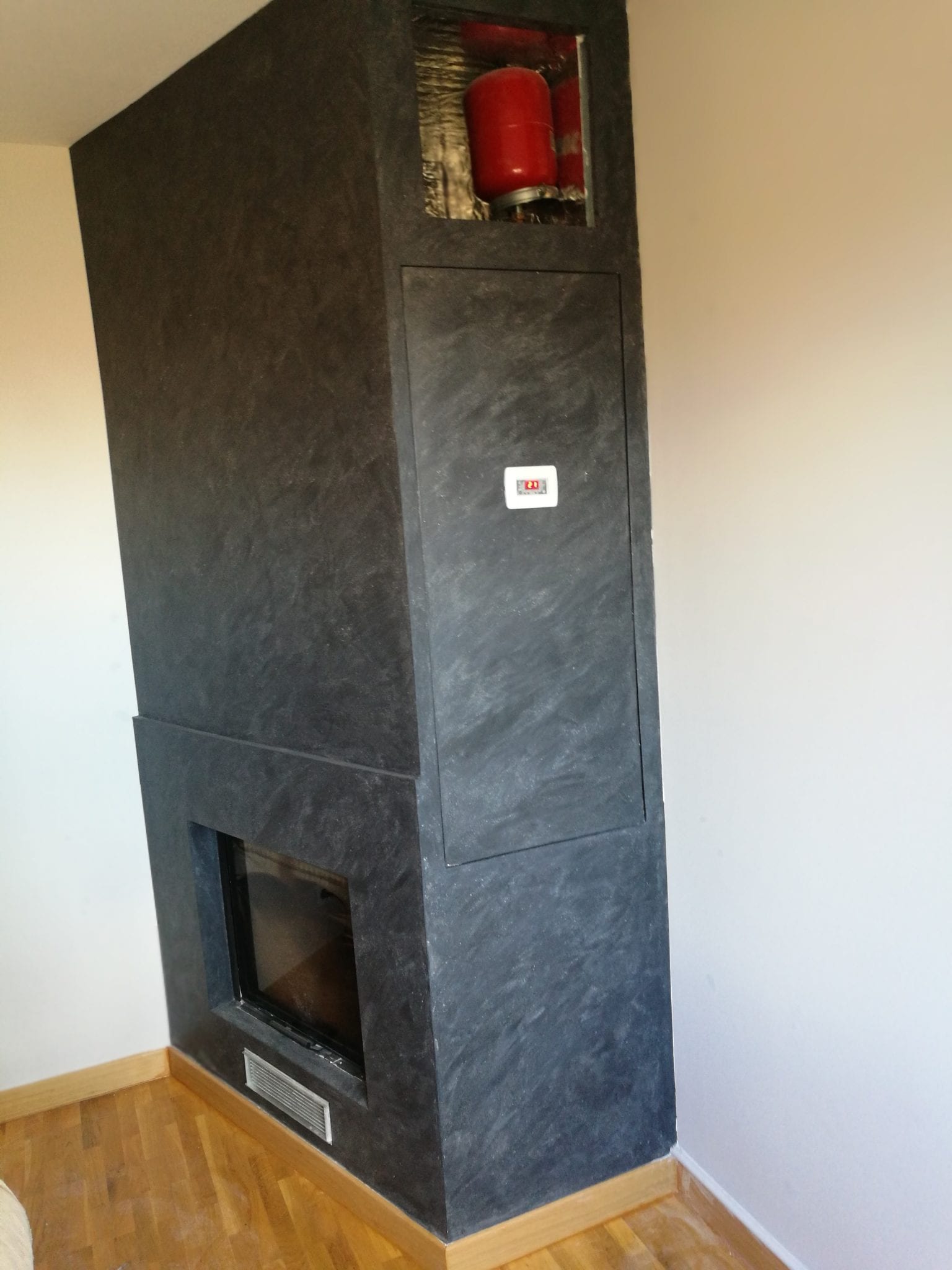 El recubrimiento  de la chimenea de leña calefactora,  se ha realizado con perfilería de acero galvanizado de 40mm y aislamiento térmico en todo el perímetro comprendido de la chimenea.
