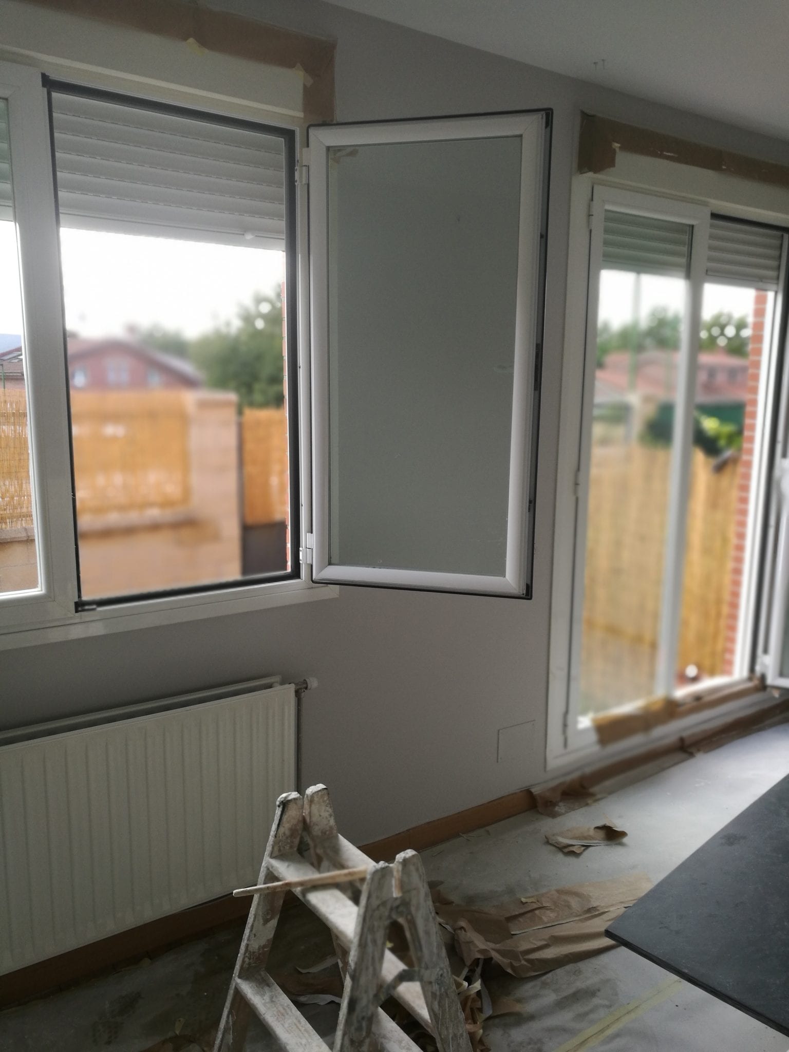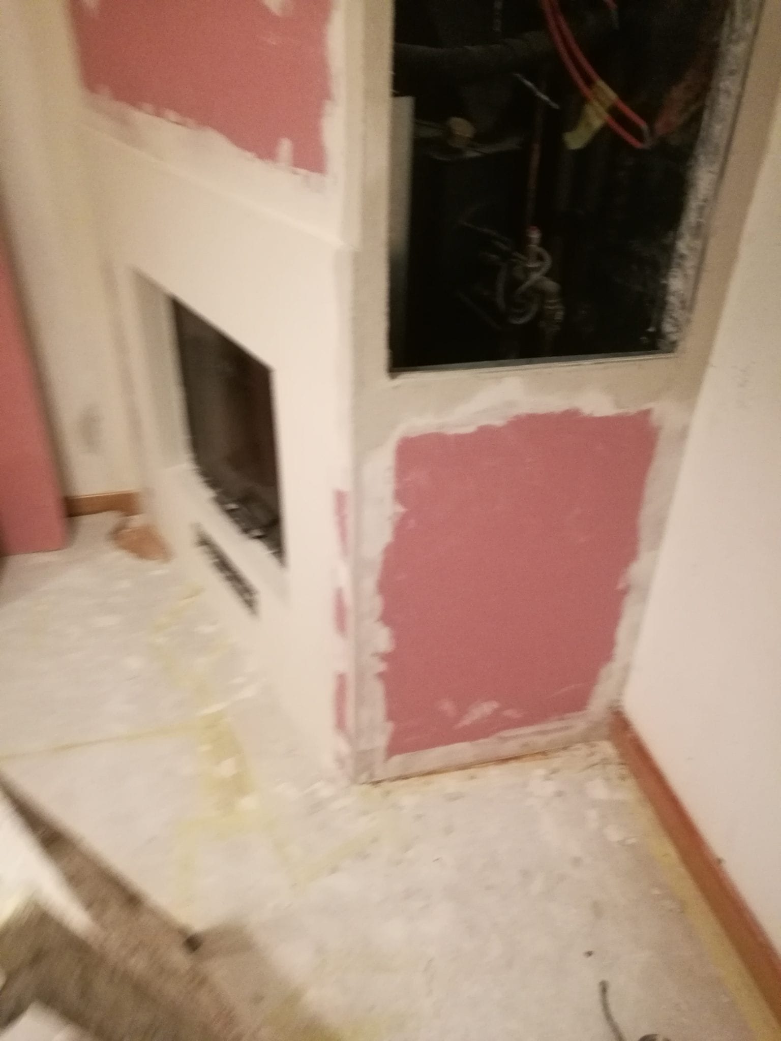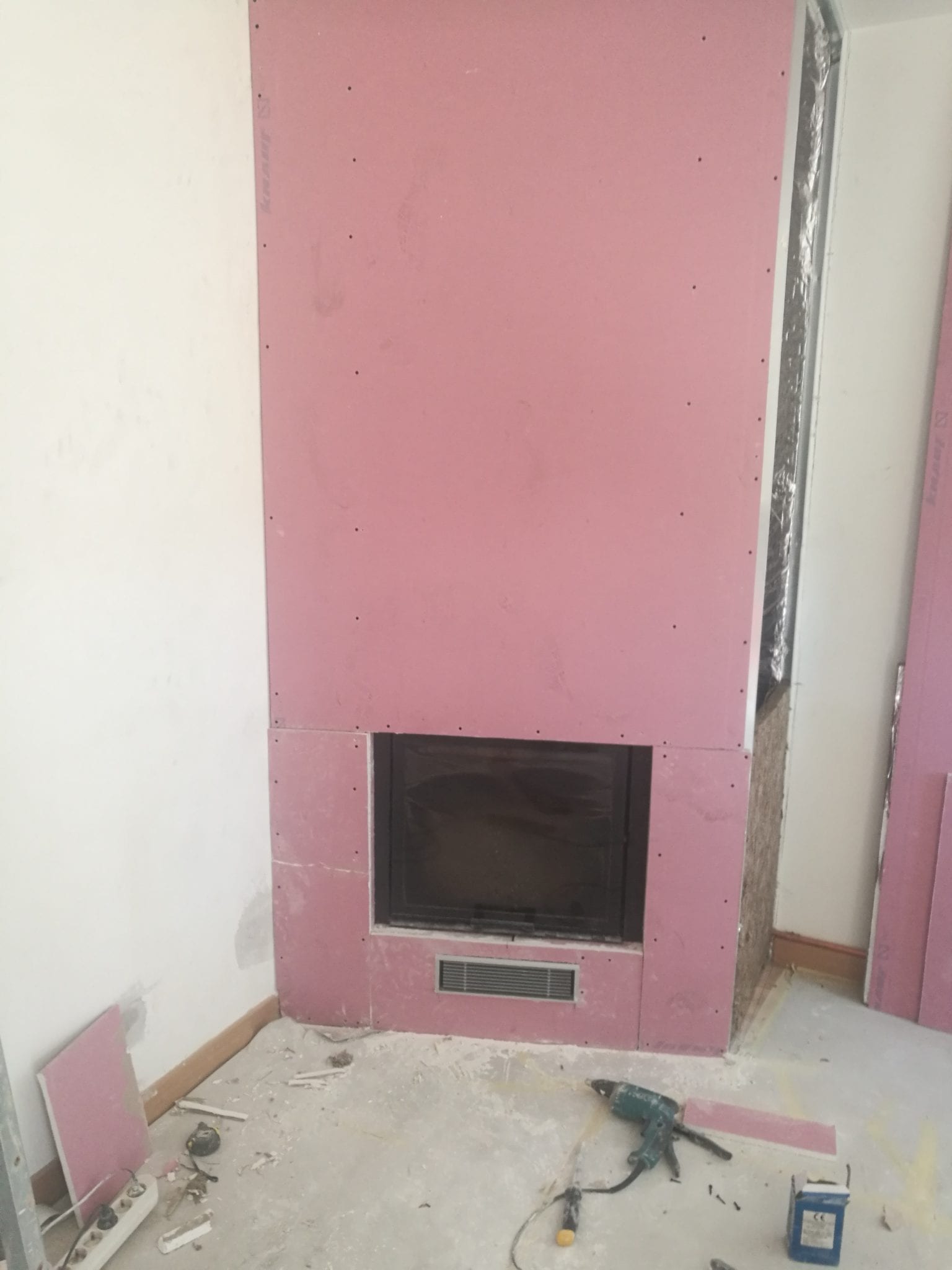 Esta obra de reforma de salón con instalación de chimenea calefactora  se realizó en una vivienda unifamiliar de la Barriada de Yagüe .
