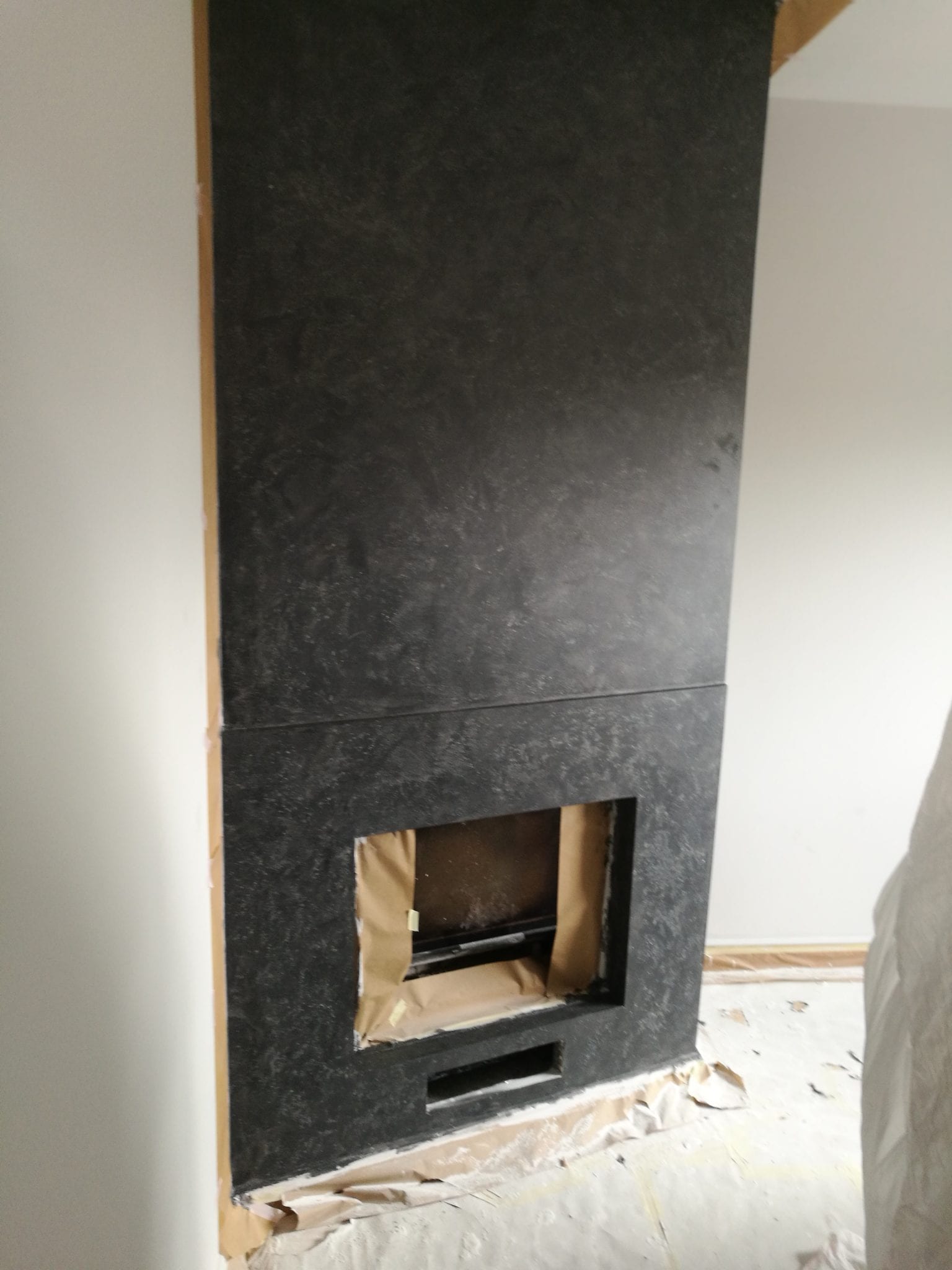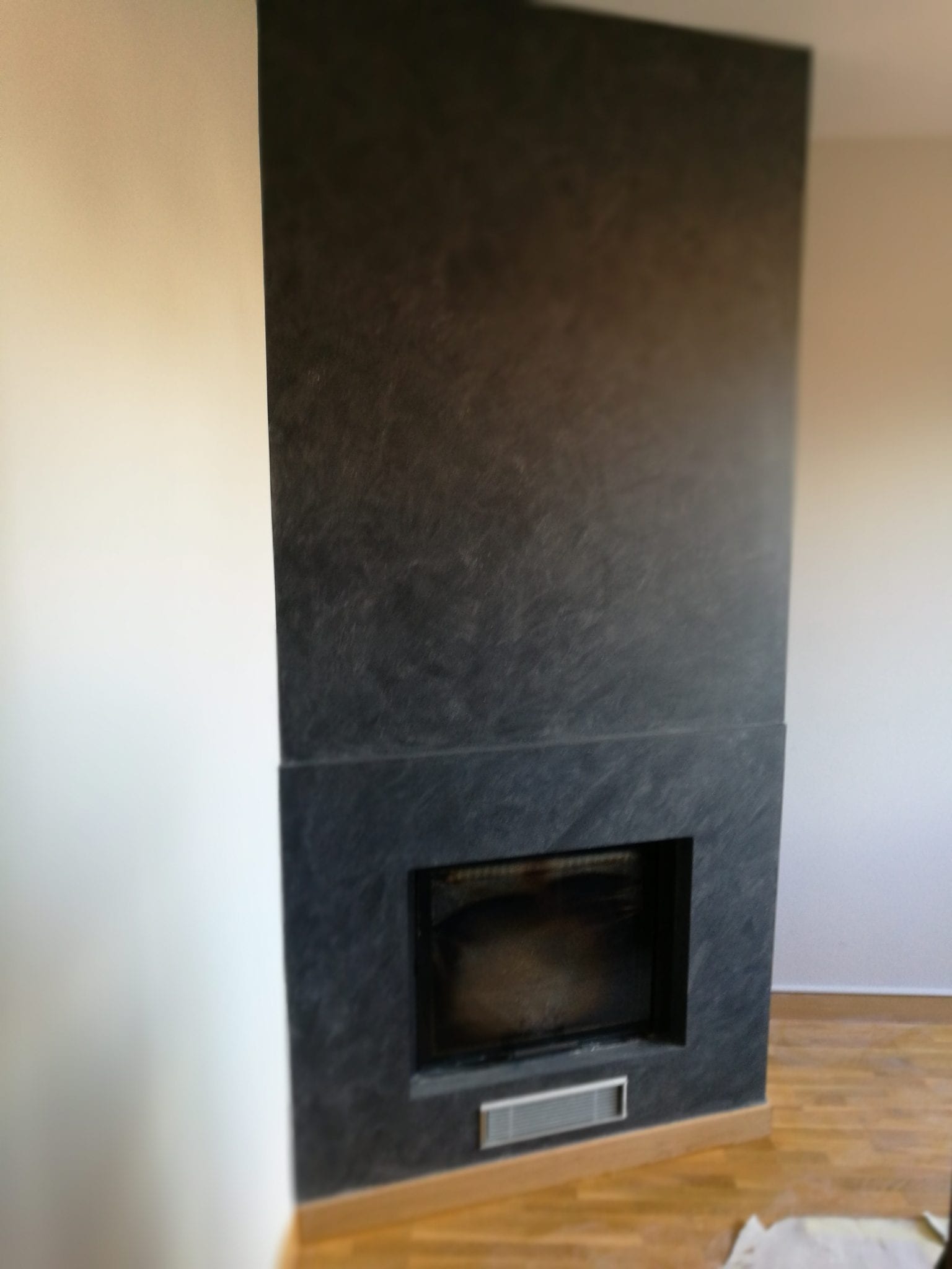 Se ha aplicado a esta chimenea un revestimiento decorativo imitando un veteado con la pintura de nuestro proveedor Pinturas Vallejo de Burgos y para facilitar su limpieza. También hemos enlucido  o alisado las paredes  y techo del mismo con pasta especial relieves,ya que tenía un revestimiento de goteleé y con  aplicación de tres manos de enlucido de paramentos verticales.