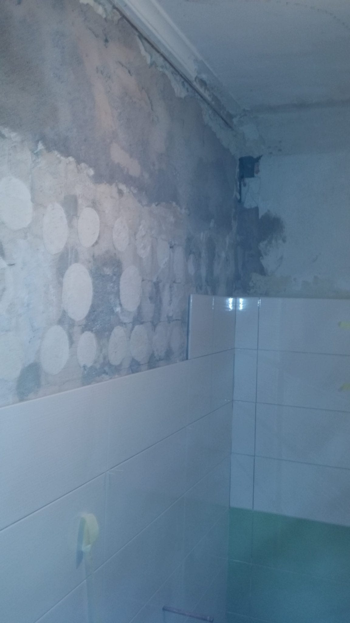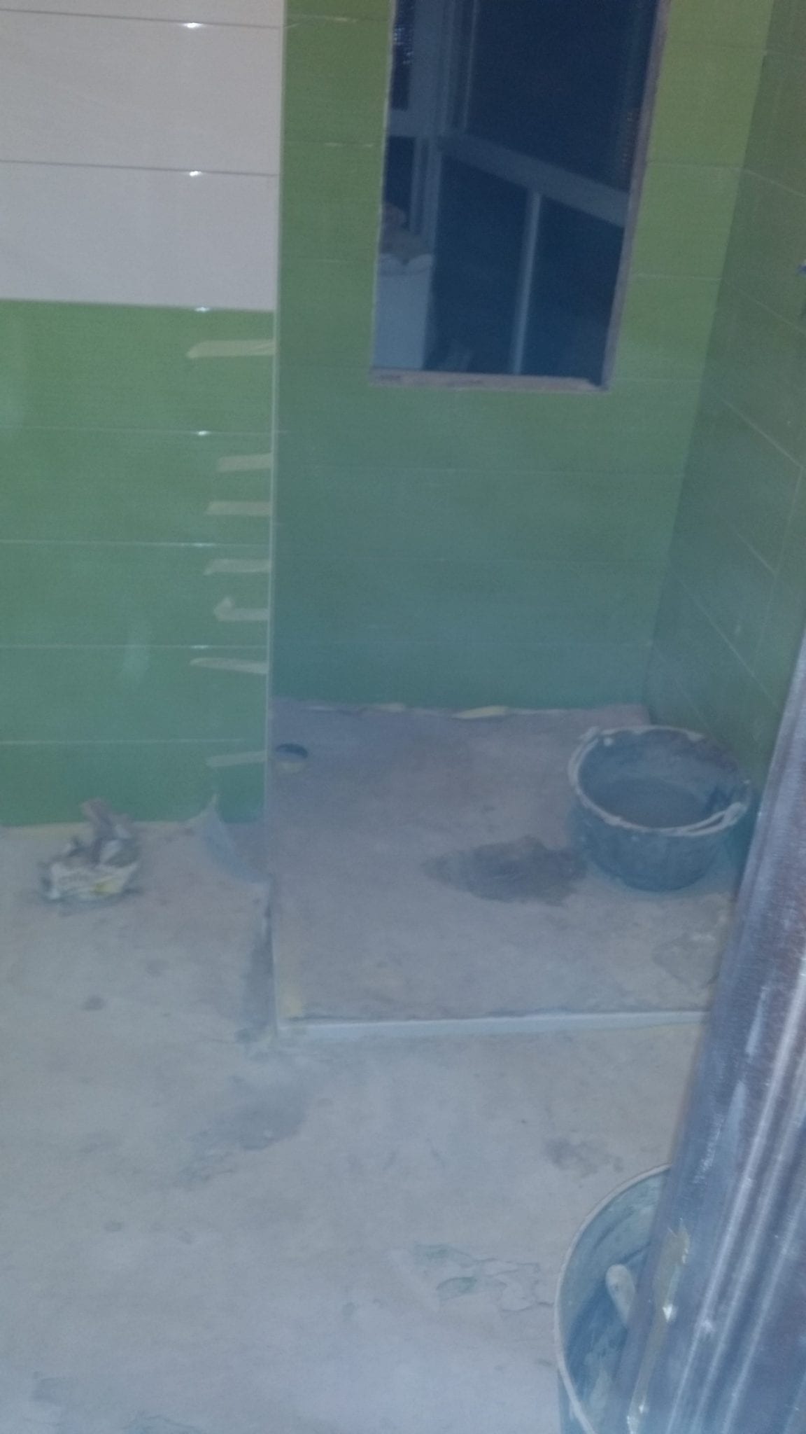 Se han realizado los trabajos de tapado de rozas de fontanería y calefacción y electricidad. Se ha realizado la correspondiente solera con mortero de cemento y arena de mina, y la preparación de las paredes del mismo. Se ha alicatado con pegamento y azulejos los suelos y paredes del mismo .Hemos realizado un techo de pladur con trampilla para llaves de corte escondidas.