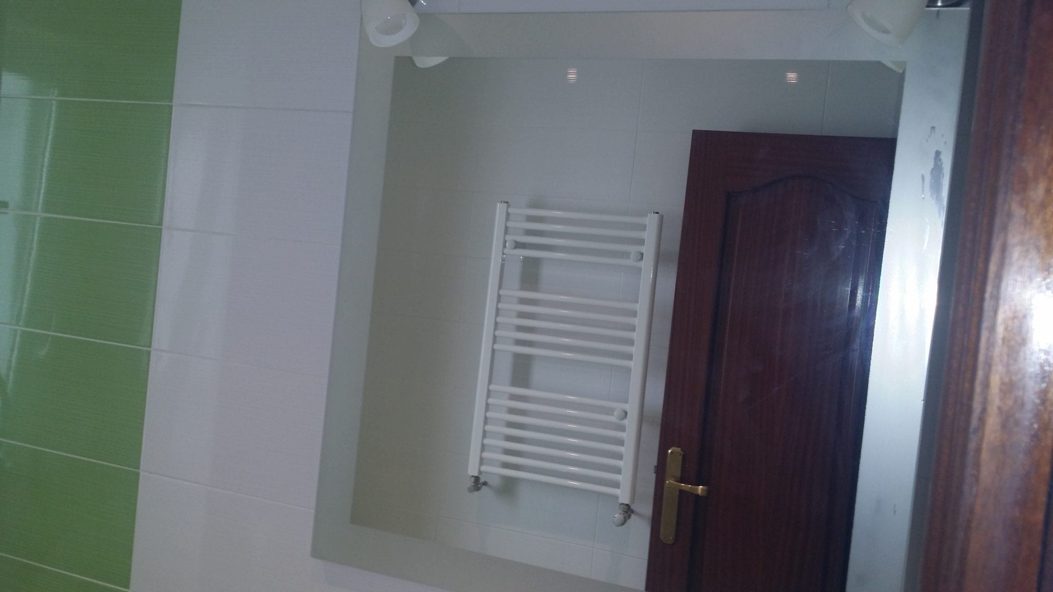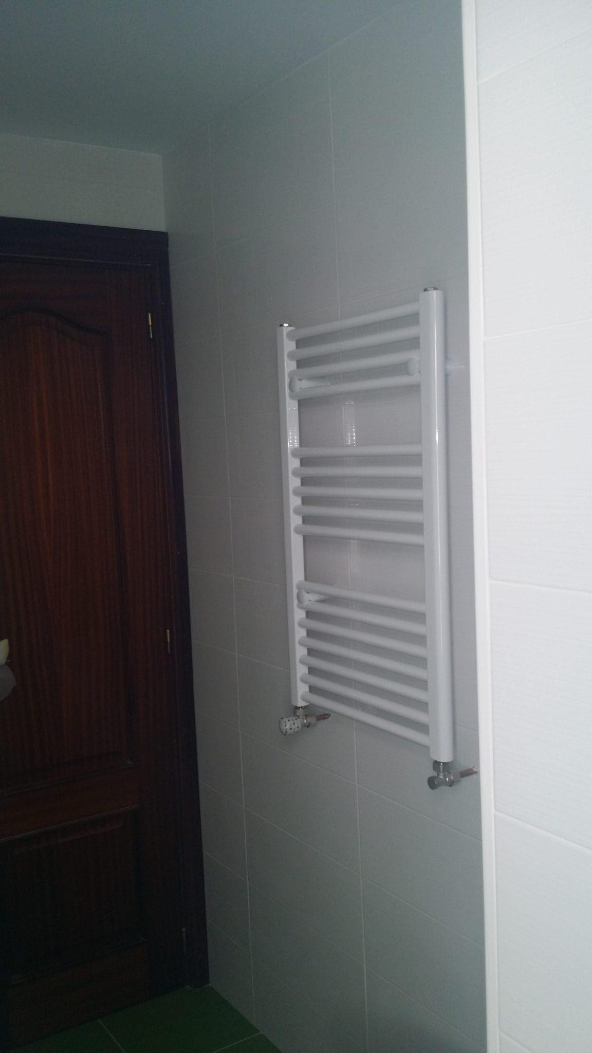 Colocación de radiador toallero , en blanco. Mueble de 80cm de anchura en color lacado en Blanco con lavabo encastrado cuadrado con grifo monomando marca buades.