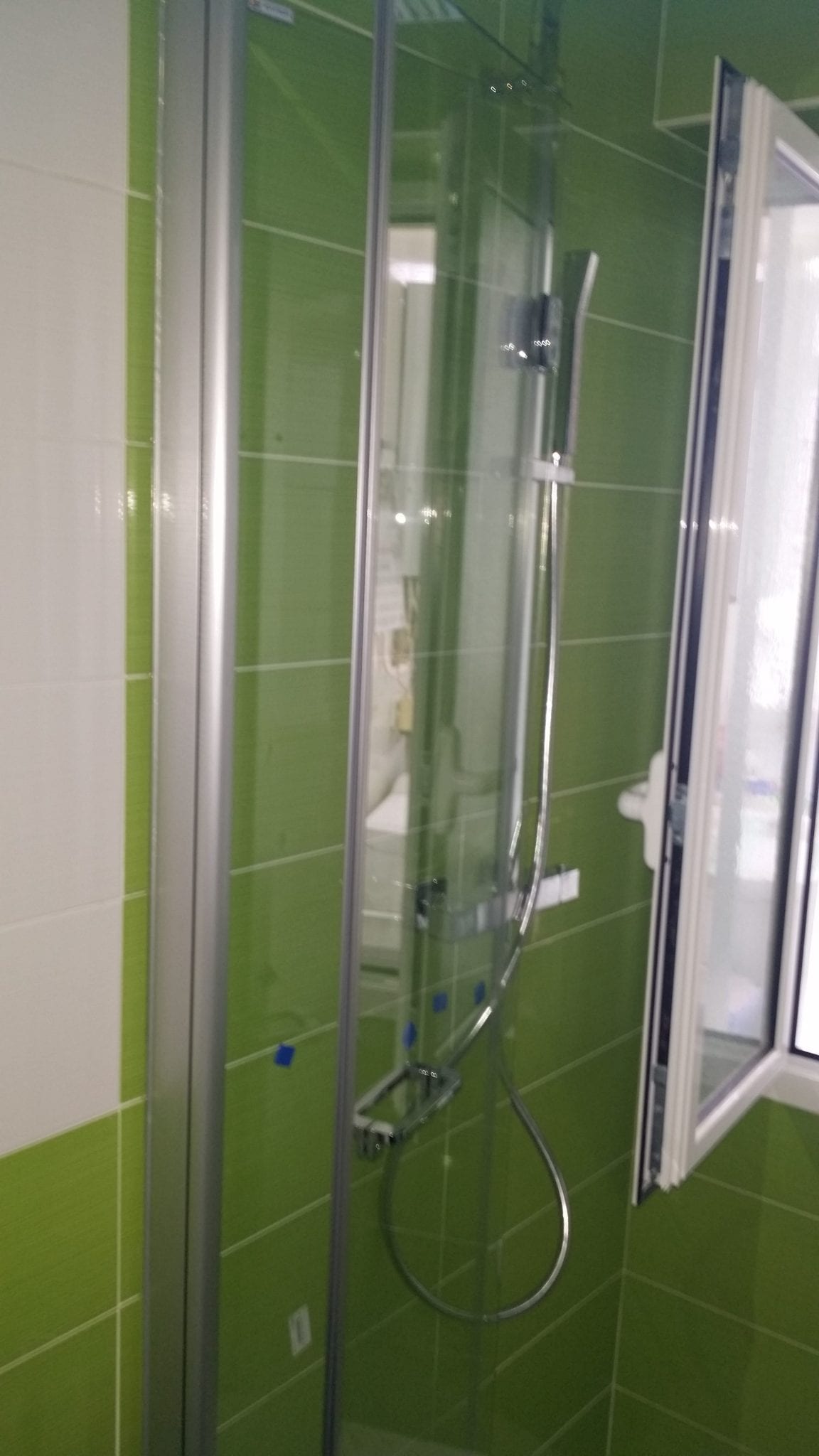 Suministro y colocación de mampara de ducha con fijo y puerta en libro de cristal suministrada por nuestro proveedor Bigmat Fontecha Burgos.
